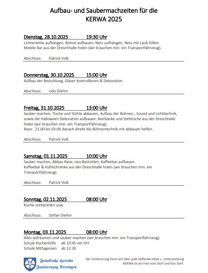 Aufbau- und Saubermachzeiten für die KERWA 2025 Veröffentlicht am 21.10.2025 von Facebook-Bot Aufbau- und Saubermachzeiten für die KERWA 2025 Der FZ Dertingen freut sich über viele Helfer – aus dem Ort, für den Ort teilen E-Mail teilen