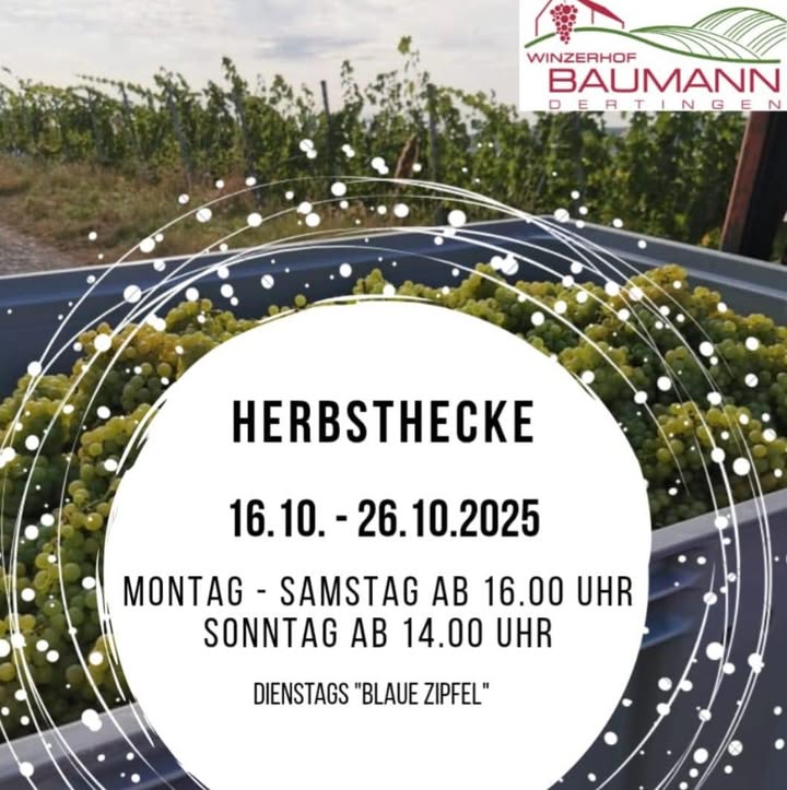 Heckenwirtschaft von 16. bis 26.10. im Winzerhof Baumann Veröffentlicht am 11.10.2025 von Facebook-Bot Heckenwirtschaft von 16. bis 26.10. im Winzerhof Baumann teilen E-Mail teilen