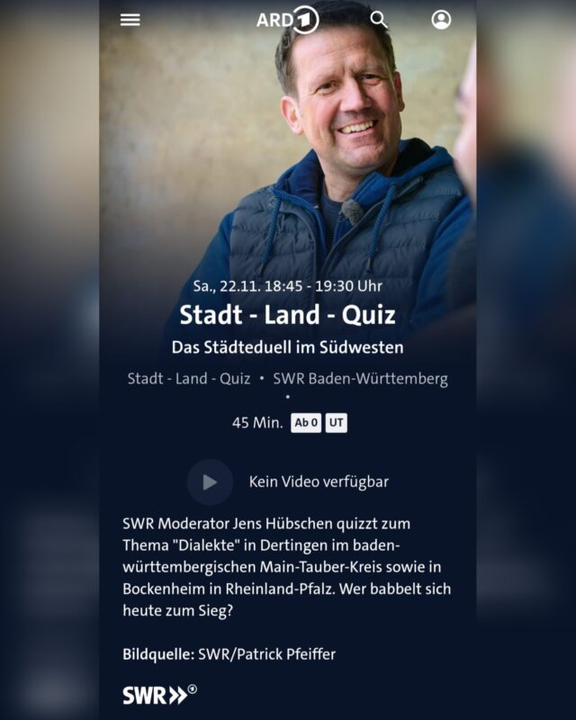 Stadt – Land – Quiz in Dertingen jetzt in der Mediathek Veröffentlicht am 24.11.2025 von Stefan Diehm Stadt – Land – Quiz Bockenheim an der Weinstraße gegen Dertingen, Thema: Dialekte → jetzt in der ARD Mediathek anschauen teilen E-Mail teilen