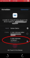 - Hier kann die „E-Mail-Adresse verborgen“ werden und dann nochmal mit Fingerabdruck (Touch ID) oder Code (der zum entsperren vom iPhone) weiter